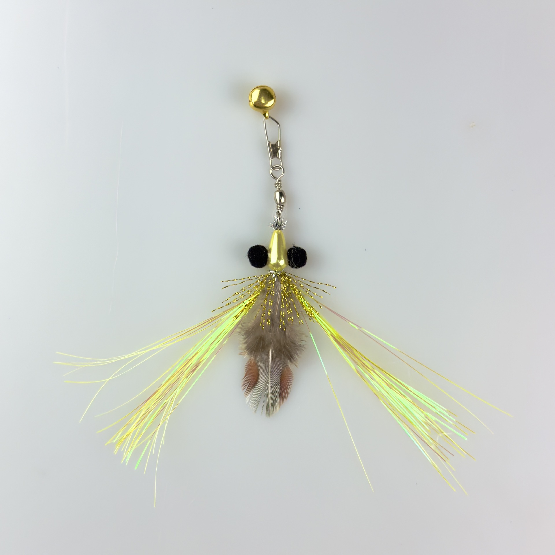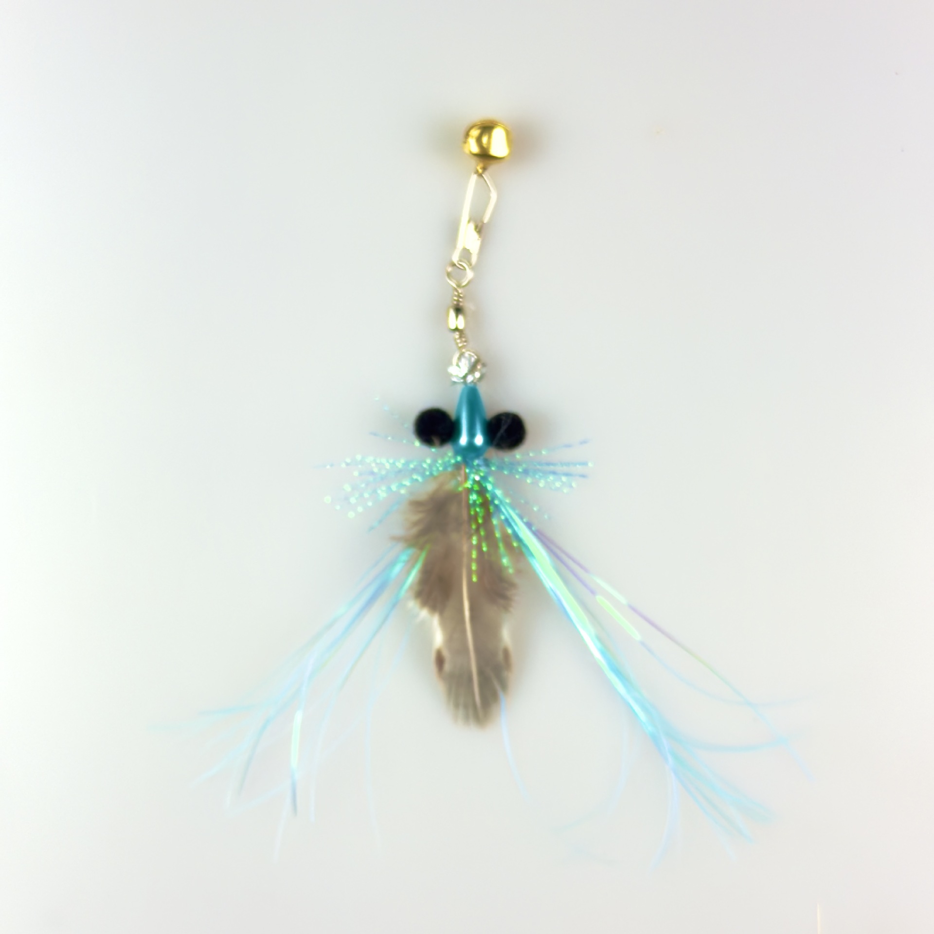 사진 촬영 한계로 실물이 더 예쁩니다. 목 부분의 털은 반짝이 점박이 실이며, 날개는 레이저 얇은 실로 제작되어 고양이가 매우 좋아합니다.
