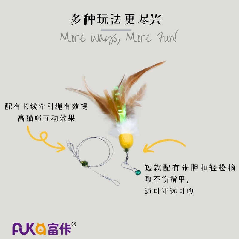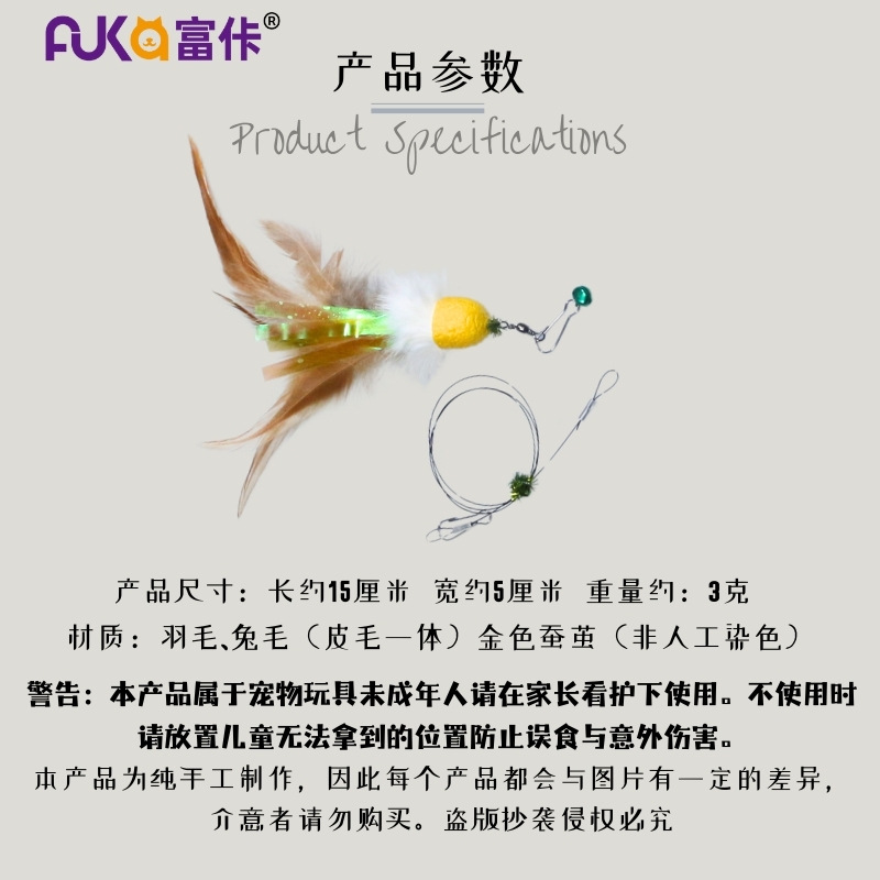 무염색 천연 깃털, 자연 금색 번데기, 진짜 토끼털로 제작되어 안전하고 내구성이 뛰어납니다. 긴 끈 버전은 멀리서도 놀아줄 수 있고, 짧은 버전은 집게 고리로 간편하게 탈착 가능합니다.